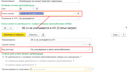 Для отражения Компенсация за использование личного автомобиля (сверх норм) необходимо создать еще одн вид начисления в справочние Способы учета зарплаты. В поле Способ отражения укажите статью затрат — вид расхода Не учитываемые в целях налогообложения.