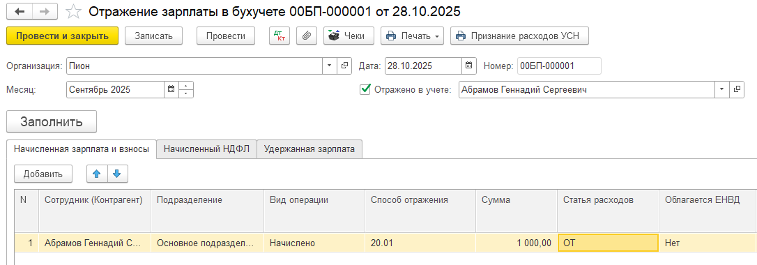 Предположим мы в ЗУП провели начисление: