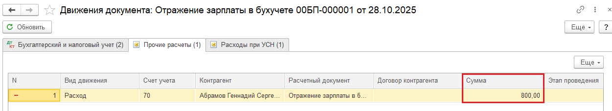 Когда мы выплатим сотруднику 800 рублей по ведомости, остатки в регистрах закроются.