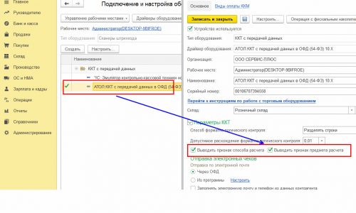 Здравствуйте Елена. Признак способа расчета для ФФД 1.0.5 обязателен. За вывод данного реквизита в чек отвечает соответствующая настройка: Администрирование—>Подключаемое оборудование—> ККТ с передачей данных—> Параметры КТТ. Необходимо включить данную опцию(скрин во вложении).
