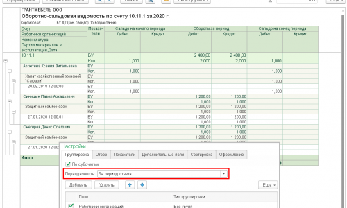 Если сформируете отчет Оборотно-сальдовая ведомость по счету МЦ.02 и в настройках отчета на вкладке Группировка укажите Периодичность — по дням, то вы увидите дату выдачи спецодежды.