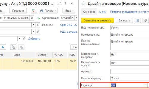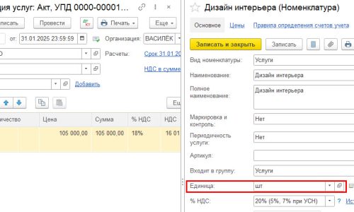 Вот пример формирования данных для единицы измерения «яяя» товара «Дизайн интерьера».