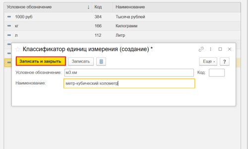 Но на этот случай разработчики предусмотрели ручное создание нужной единицы измерения в справочнике Классификатор единиц измерения по кн. Создать.
