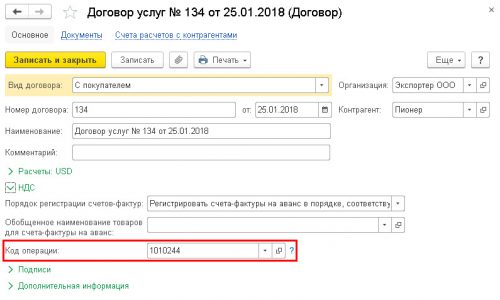 3. В договоре нет возможности выбрать код операции, она выбирается в счет-фактуре на реализацию.