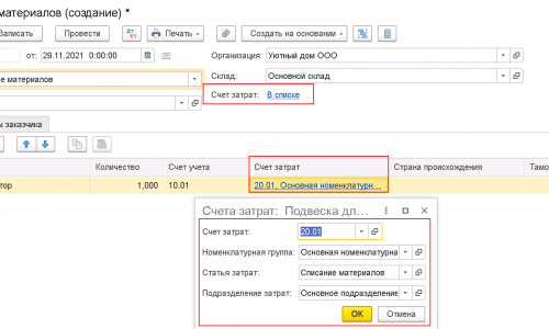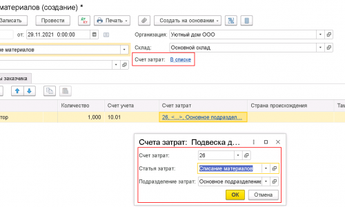 Если же Счета затрат указать в Списке, тогда нет возможности указать аналитику «Подразделение»…