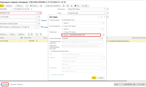 Добрый день! Компания занимается торговлей и доставку товара осуществляет за свой счет. Водитель компании на служебном автомобиле забирает со склада товар и отвозит его в транспортную компанию для доставки до покупателя. Подскажите, пожалуйста, как в таком случае отразить данную информацию по доставке транспортной компанией в УПД для покупателя? (Бухгалтерия предприятия, редакция 3.0 (3.0.169.18).