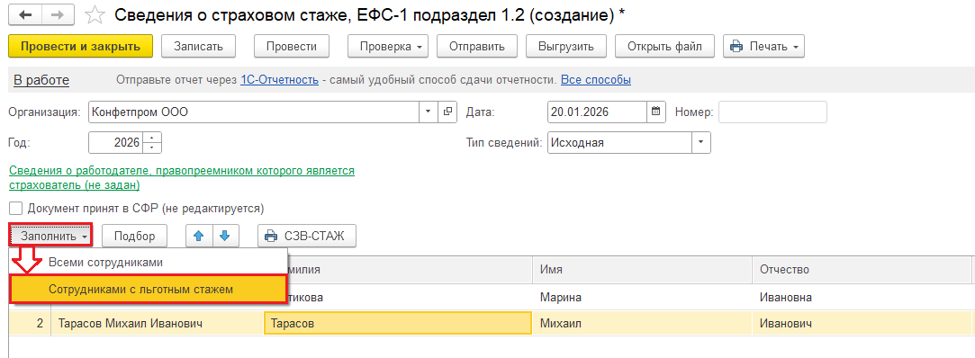 Добрый день! Отчет ЕФС-1 подраздел 1.2. по кнопке Заполнить — Сотрудники с льготным стажем заполняется автоматически, если помимо кода ОКУ у сотрудников есть РК:
