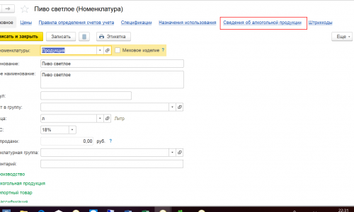 В элементе справочника Номенклатура появится гиперссылка Сведения об алкогольной продукции.