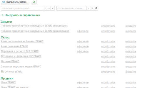 Тогда в разделе Администрирование — Настройки программы можно сделать настройки обмена с ЕГАИС. Из раздел Администрирование можно осуществить обмен с ЕГАИС.