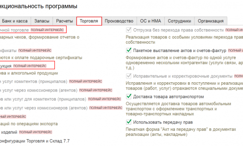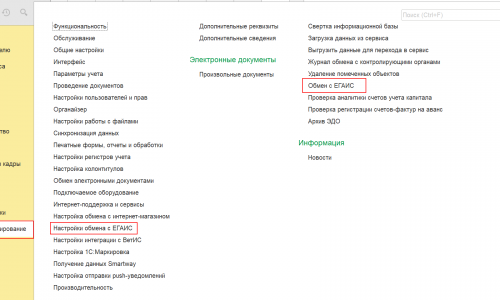 Для взаимодействия в ЕГАИС и работы с алкогольной продукцией необходимо сделать настройки. Раздел Администрирование Настойки программы — Функциональность на вкладке Торговля поставить флажки: