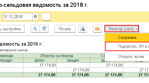 В программе необходимо настроить ЭЦП. Что бы регистры бухгалтерского и налогового учета были подписаны ЭЦП, сформируйте регистр на основании стандартного отчета или справки-расчета. Далее – кнопка Регистр учета – Подписать ЭП и сохранить. В открывшемся окне введите пароль — кнопка Подписать