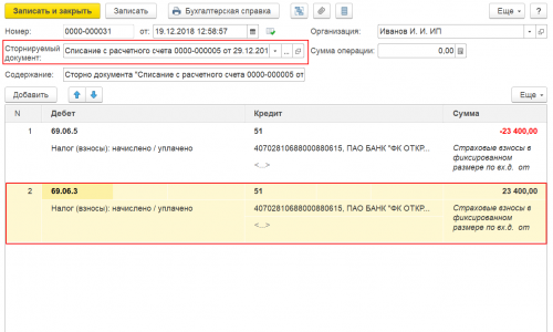 — Сторнировать платеж в ПФР документ Операция, введенная вручную вид операции — Сторно документа. Выбрать документ Списание с расчетного счета, которым перечислялись взносы в ПФР. Скопировать проводку и указать счет 69.06.3 Взносы в ФОМС. Данной операцией будет отражена переплата по ФОМС. При закрытии месяца декабрь данная переплата будет учтена, как оплаченные взносы в ФОМС и налог УСН а 2018 г.будет уменьшен на сумму начисленных за 2018 г. взносов ФОМС — 5840 руб.