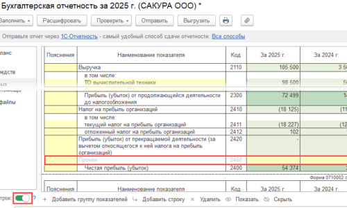 У вас, видимо, упрощенная отчетность. Там возможности добавить строку 2460 уже нет. Какая операция была отражена в стр. 2460 в 2024 году? Может быть по смыслу подойдет 2410 отдельная? Один и тот же код у двух строк возможен, как раз в ситуации, когда есть существенный показатель, который надо выделить. Но, поскольку формат представления БФО содержит закрытый перечень кодов, другие коды добавить нельзя. Поэтому выбираем наиболее подходящий по смыслу из имеющегося перечня.