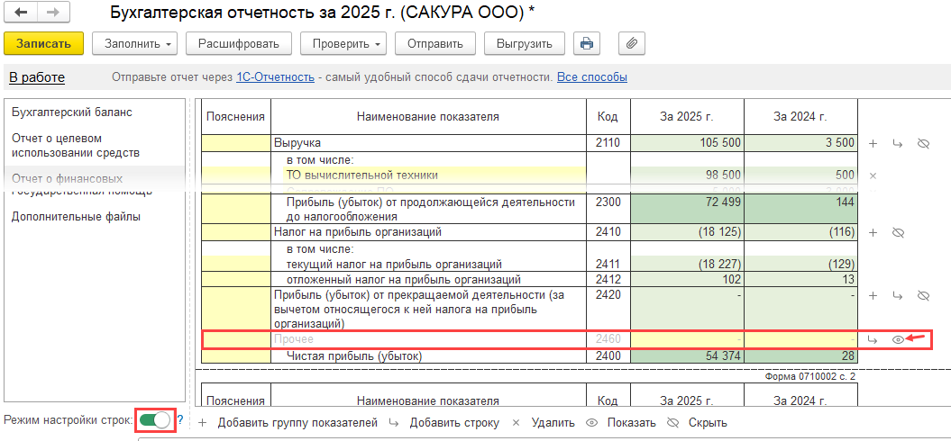 Сроку 2460 можно добавить в форму ОФР в режиме настройки строк (рис.1)