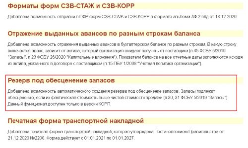 — релиз 3.0.88, 3.0.86, 3.0.85, 3.0.84: учет готовой продукции по плановой стоимости; обесценение запасов (КОРП); остатки запасов по срокам хранения; отмена методических указаний по спецодежде; инвентаризация спецодежды и инвентаря за балансом; отражение выданных авансов по разным строкам бух баланса;