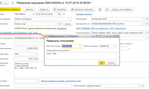 Названия и реквизиты организации и ее контрагентов загружаются в платежное поручение из справочников Организации (Главное — Организации) и Конрагенты (Справочники — Покупки и продажи — Контрагенты) соответственно.