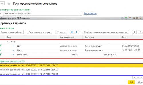Вы можете отобрать период и получателя в Отборе групповой обработки изменения реквизитов.