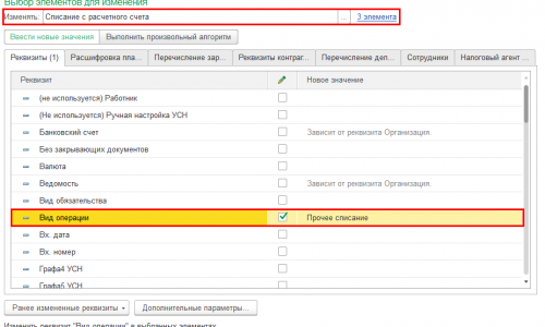 Добрый день. Банковские выписки в 1С 8.3 Бухгалтерия при проведении операции “Изменение выделенных документов” нет реквизита: