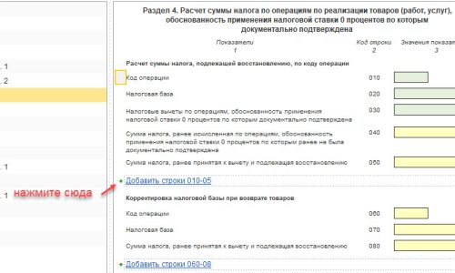 Компания оказывает услуги по международным перевозкам на основании договора транспортной экспедиции и при заполнении декларации НДС в разделе 4 по строке 010 код вида операции ставит 1011410. Кроме импорта услуг компания в октябре продала насос на экспорт в Китай. Собран полный пакет документов. Как в таком случае заполнить раздел 4, а именно строку 010, чтобы одновременно заполнились два кода вида операции и две базы по НДС по этим услугам.