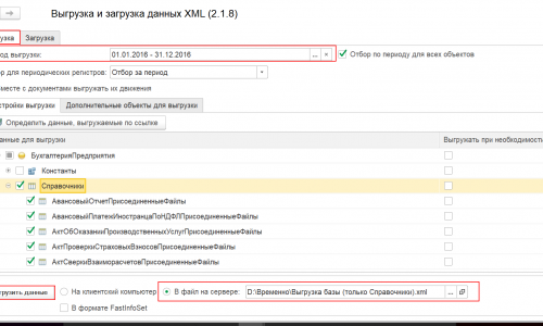 Елена, если будите пользоваться обработкой “Выгрузка и загрузка данных xml”, то сначала запускаете эту обработку в базе из которой необходимо выгрузить данные. На вкладке — Выгрузка задаете параметры выгрузки и указываете файл, в который будут выгружаться данные.
