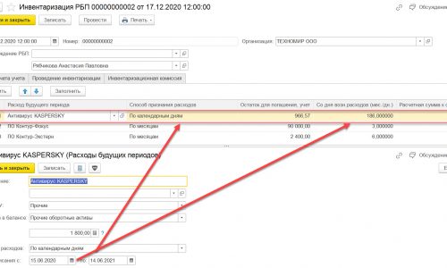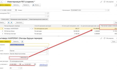 — по месяцам: (Количество мес. с начала списания до проведения инвентаризации)/(Всего месяцев списания) * Сумму РБП в карточке