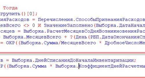 Поэтому расчетный коэффициент определялся пропорцией дней списания до инвентаризации/общее число дней и сюда прибавлялась 1, т.е. получалось не 0,5234…, а 1, 5234… и результат соответственно выходил очень странный!