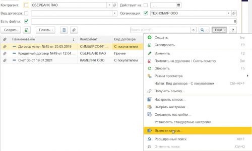 Или можно прямо из раздела справочники — Договоры — кн. ЕЩЕ — Вывести список сохранить в файл Excel информацию по первой колонке и договору контрагента и анализировать ее в Excel.