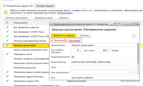 Для автоматической загрузки курсов валют, необходимо зайти в раздел Администрирование – Обслуживание – Регламентные операции — Регламентные и фоновые задания. Найти регламентное задание “Загрузка курсов валют” и поставить флажок активности. Тогда эта операция будет повторяется ежедневно автоматически. Так же по гиперссылке Расписание можно настроить расписание по которому будут загружаться курсы валют.