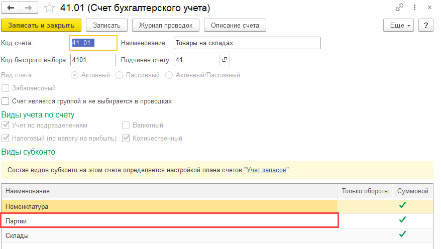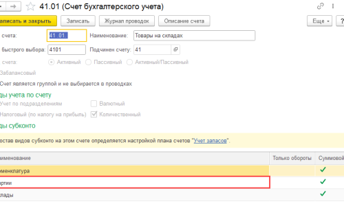 Проверьте в Плане счетов по счету 41.01 стоит субконто Партия?