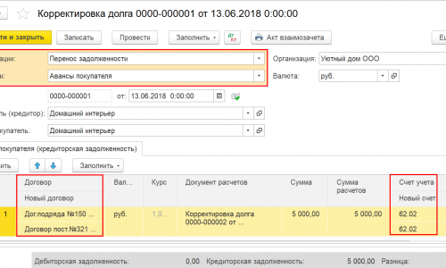 2. Перенос Аванса с одного договора на другой Оформить документ Корректировка долга: