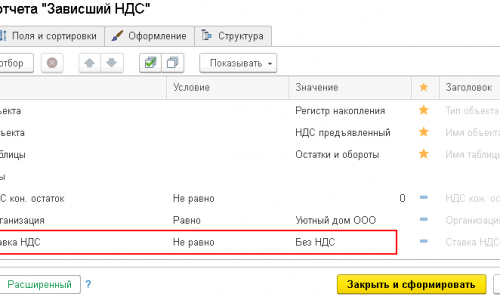 Уточните, пожалуйста про какой отчет идет речь? Если про отчет Универсальный отчет для проверки зависшего НДС ? Для того, чтобы не отражались документы со ставкой НДС — «Без НДС» на вкладке Отборы добавьте отбор Ставка НДС Неравно — Без НДС.