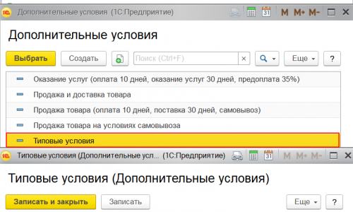 Дополнительные условия для конкретного счета об оплате, о поставке, о транспортировке и др. указываются непосредственно в документе Счет покупателю гиперссылка Реквизиты продавца и покупателя. Вы можете скорректировать уже существующие Дополнительные условия или созвать новые указав необходимые данные об оплате, поставке и т. д.
