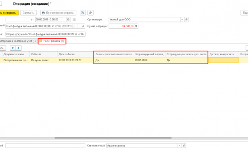2. На закладке НДС продажи заполняете как у меня на скрине: Запись дополнительного листа — Да, Сторнирующая запись — Да, Корректируемый период — дата с/ф