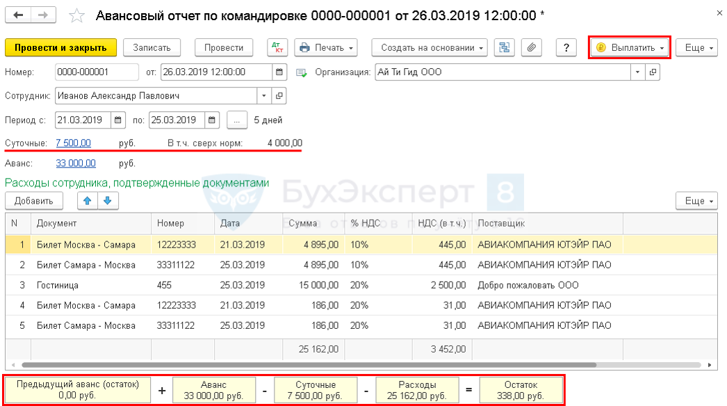 А в Бухгалтерии проводить начисление в рамках Авансового отчета: