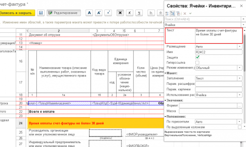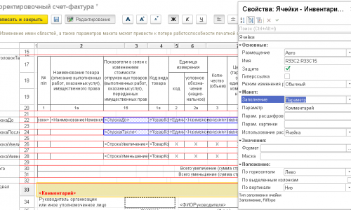 Каждое поле в счет-фактуре прописывается программно. Вывод данных в макет происходит в общем модуле программы в Процедура ВывестиСчетФактуруВТабличныйДокумент(ТабДокумент, Макет, ВыборкаСФ, ЭтоУниверсальныйПередаточныйДокумент = Ложь)