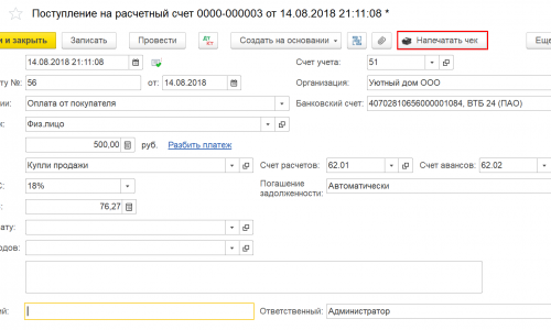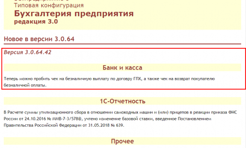 Последнем июльском обновлении БП 3.0.63 была добавлена возможность пробития чека на поступление безналичной оплаты из документа «Поступление на расчетный счет».