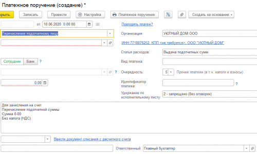 Создали платежку для перечисления работнику суточных.