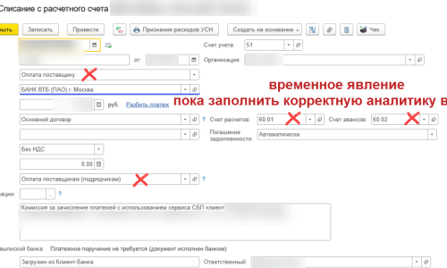 Загружаем выписку банка от ВТБ и Комиссия банка загружается с Видом операции — Оплата поставщику.