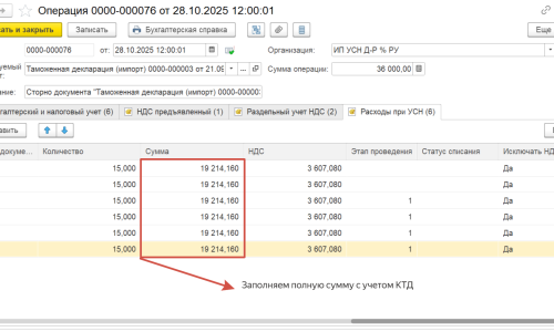 Да, нужно указать в строчках значения со знаком «+», заполнить данные с учетом КТД (указать полную сумму пошлины), чтобы списались таможенные платежи после реализации товаров при закрытии месяца.