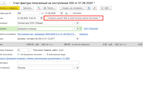 Спасибо большое, Татьяна. Я поняла почему у меня при внесении корректировочного счета-фактуры февралем, он попадал в книгу продаж за 1 квартал. Убрала галочку в поле восстановить НДС в книге продаж. Теперь при формировании книги покупок за 2 квартал, в нее попадает первичный счет фактура с кодом вида операций 01, номер счета фактуры в графе3- первичного, сумма в графе 15 с учетом НДС по первоначальному счет-фактуре, а в графе 16- сумма НДС с учетом корректировки. Это верное заполнение книги покупок?