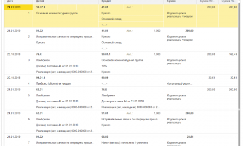 При проведении документа «Корректировка реализации» (корректирую реализацию прошлого года, сумма увеличивается) в налоговом учете делаются проводки:
