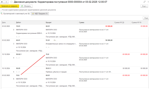 Создайте на основании первоначального поступления ПАК «Корректировку поступления».