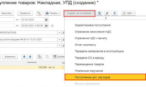 Скрин на 3.0.111.25 и виден список, что можно создать на основании Поступления — он очень обширный. Это только небольшая часть.