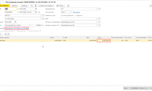В документе Поступление в лизинг указываем общую стоимость лизинговых платежей по договору (Сумма лизинговых платежей + выкупная стоимость) 6 000 000 (в т.ч НДС 1 000 000). Вносим график лизинговых платежей — суммы должны совпадать 6 000 000 руб.