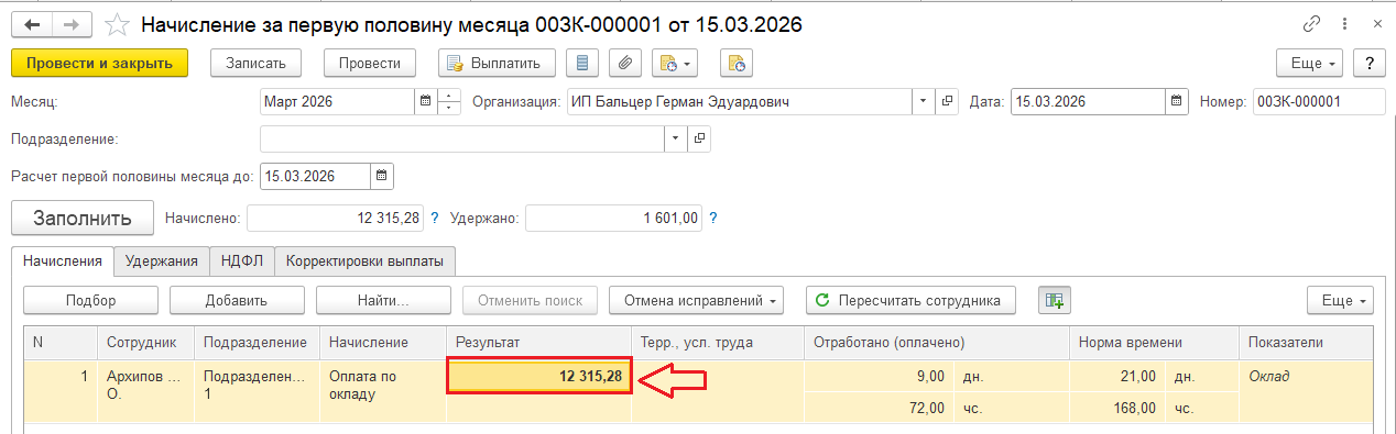 Если рассматривать вариант с доначислением дохода, тогда в аванс мы должны были начислить 12 315,28 — НДФЛ 1601 = к выплате 10 714,29.
