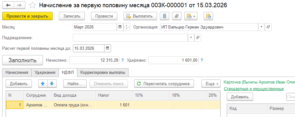 Тогда при следующей выплате дохода программа автоматически уменьшит сумму к выплате на 1 392 и в колонке НДФЛ добавит данную сумму.
