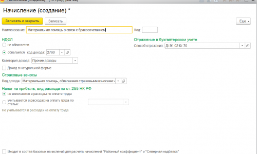 – Наименование – например, Материальная помощь в связи с бракосочетанием;