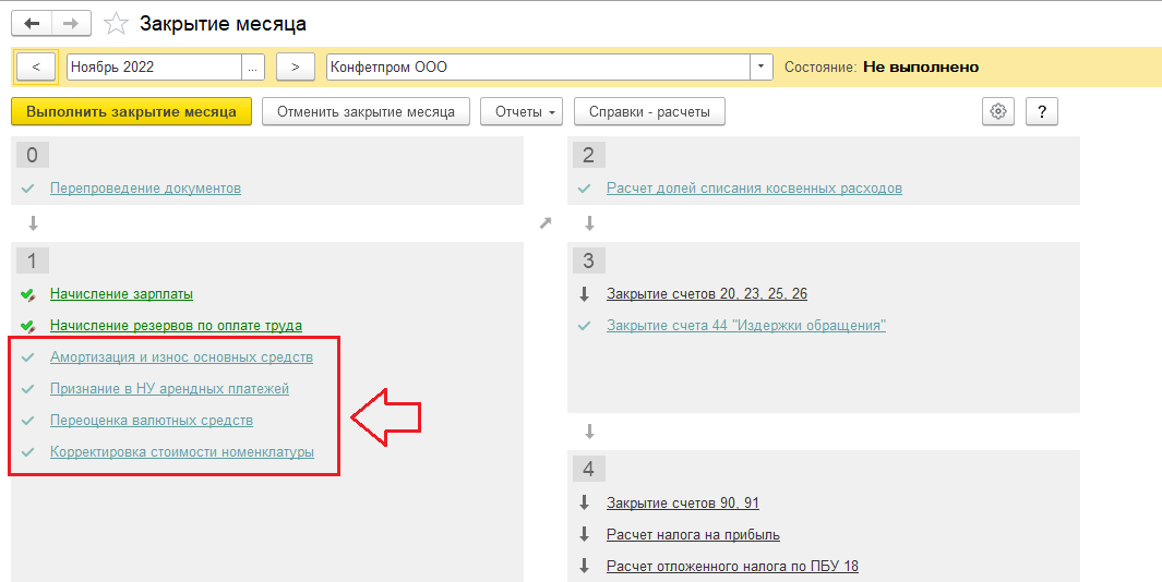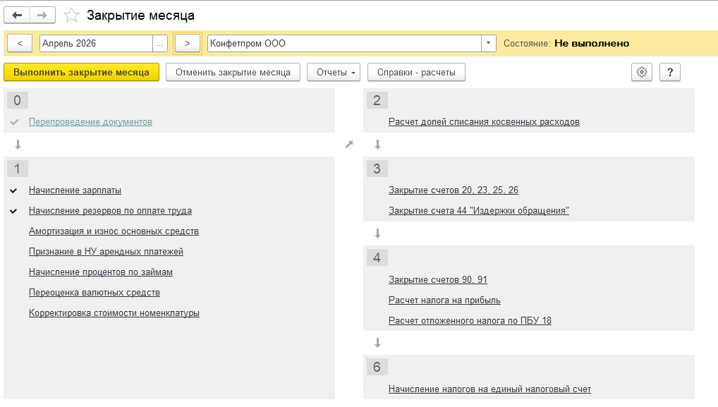 Если закрытие месяца проведено, на была нарушена последовательность проведения документов, программа отразит регламентные операции так: