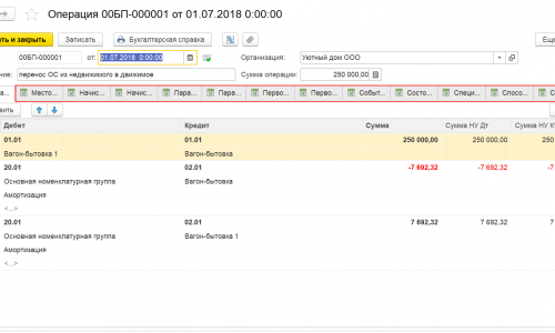 2. Так как в программе нет специального документа для перевода ОС из недвижимого в движимое. Можете воспользоваться документом Операция, введенная вручную. Создайте в справочнике ОС новое основное средство. Перенесите первоначальную стоимость ОС на счете 01.01 и накопленную амортизацию на 02.02 с ОС –недвижимость на ОС –движимое имущество.
