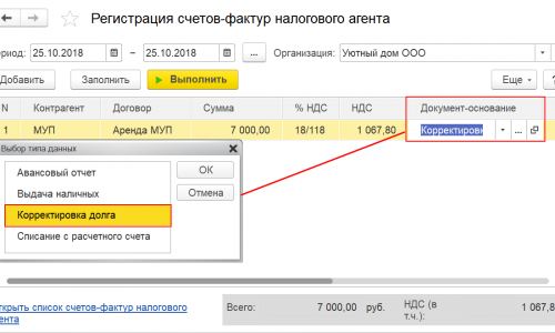 Счет-фактуру налогового агента можно оформить из раздела банк и касса — Регистрация счетов-фактур — Счета-фактуры налогового агента кнопка Заполнить. Или кнопка добавить, тогда в поле Документ основания ля выбора будет доступен документ — Корректировка долга.